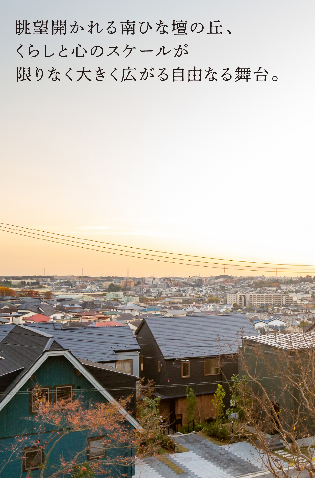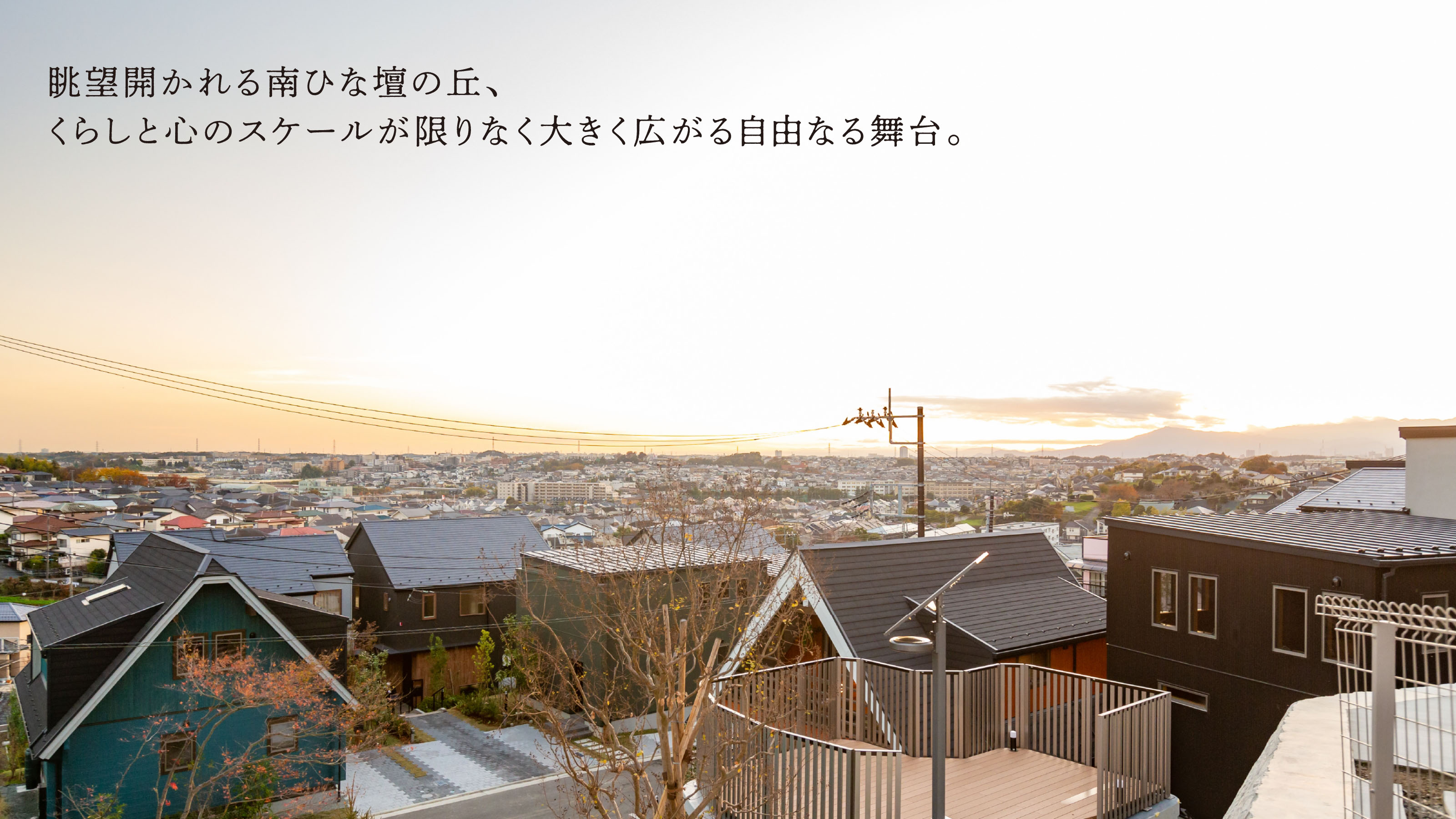 遠く丹沢山系の緑の稜線までを望む眺望が開かれ、大きな空がどこまでも広がっていく地。
