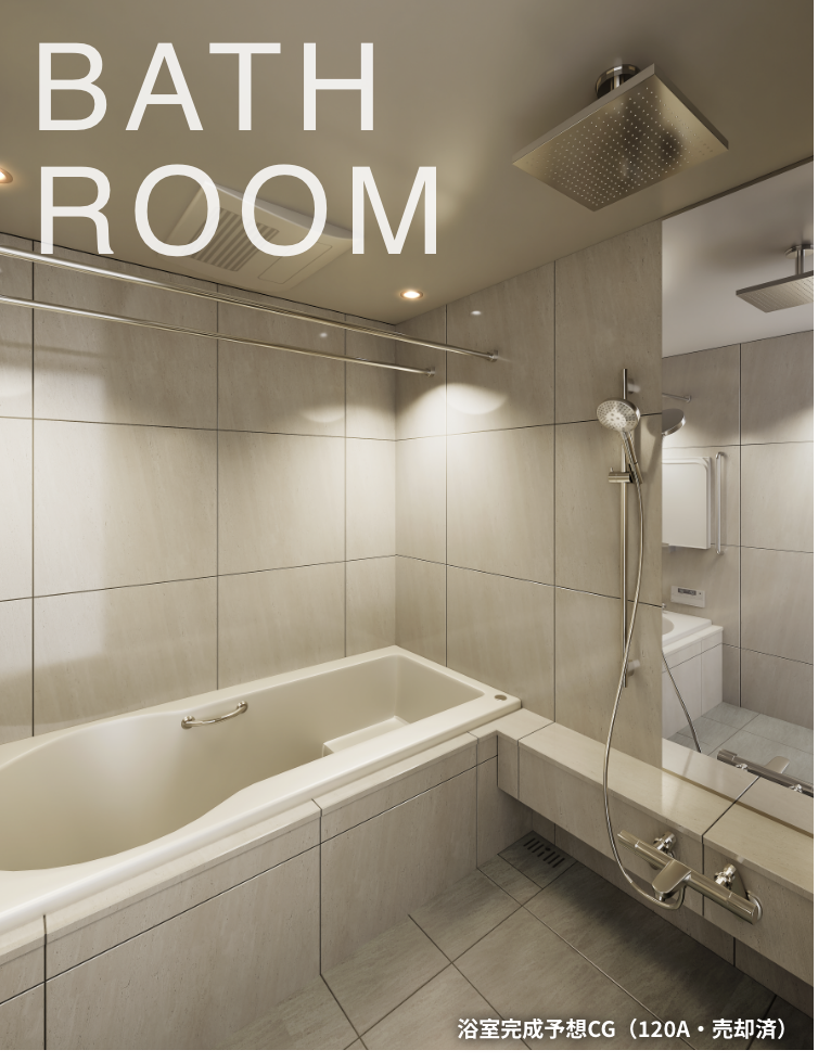 掲載の洗面化粧室と浴室の完成予想CGは、120Aタイプ(売却済)を基に描き起こしたもので、仕様・仕上げ等実際とは異なります。