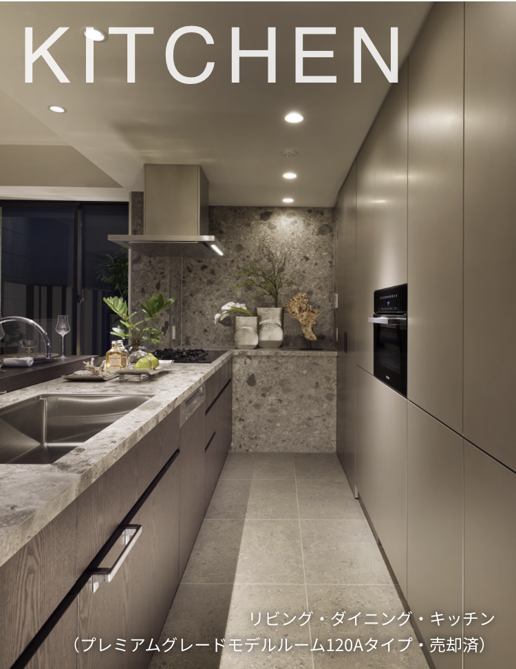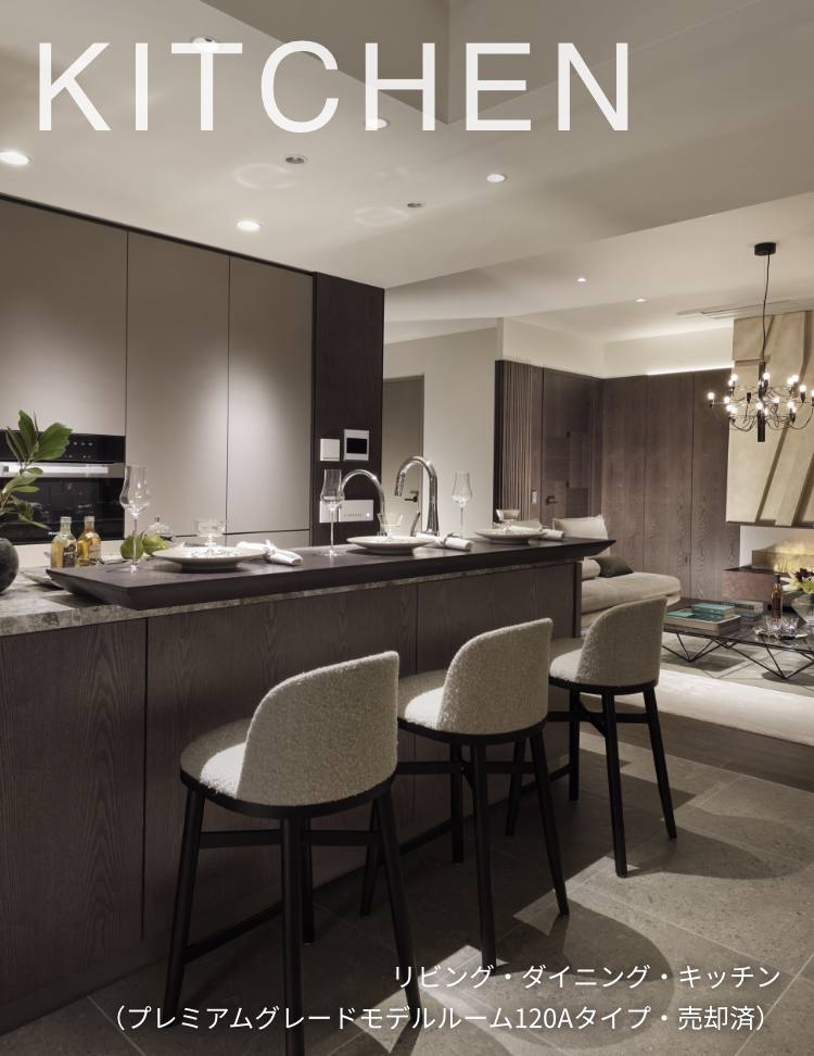 キッチンには、美観と耐久性の強さを兼ね備えた優美で高級感溢れるセラミックタイル天板※1を採用。洗練されたインテリアのキャビネット、デザイン性の高いグースネック水栓や食器洗浄乾燥機も標準装備。上質なキッチンアイテムの数々が料理を創る時間を贅沢な歓びに変えます。