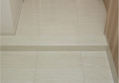 廊下の床材は玄関タイルと同素材のタイル貼りを採用。上質な光沢があり、ラグジュアリーな佇まいを演出します。