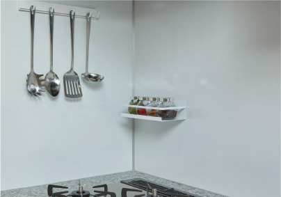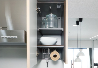 食器やキッチンツールを収納できる吊り戸棚を採用しました。ラップやキッチンペーパーが収納できるホルダーを設置し、キッチンツールを美しく収められます。