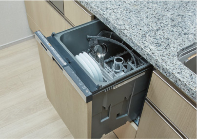 食器の出し入れがしやすいスライドオープン式です。手洗いに比べ節水効果が高く、食器の洗浄から乾燥まで、食後の水仕事を軽減します。