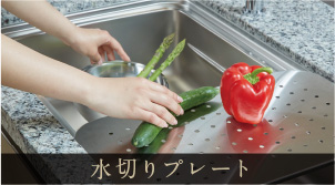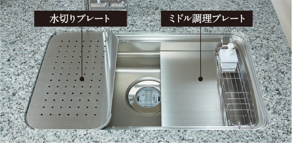 水切りプレートやミドル調理プレートの活用で調理効率をあげます。また、食器が当たる音や水はね音等を軽減する静音仕様としています。
