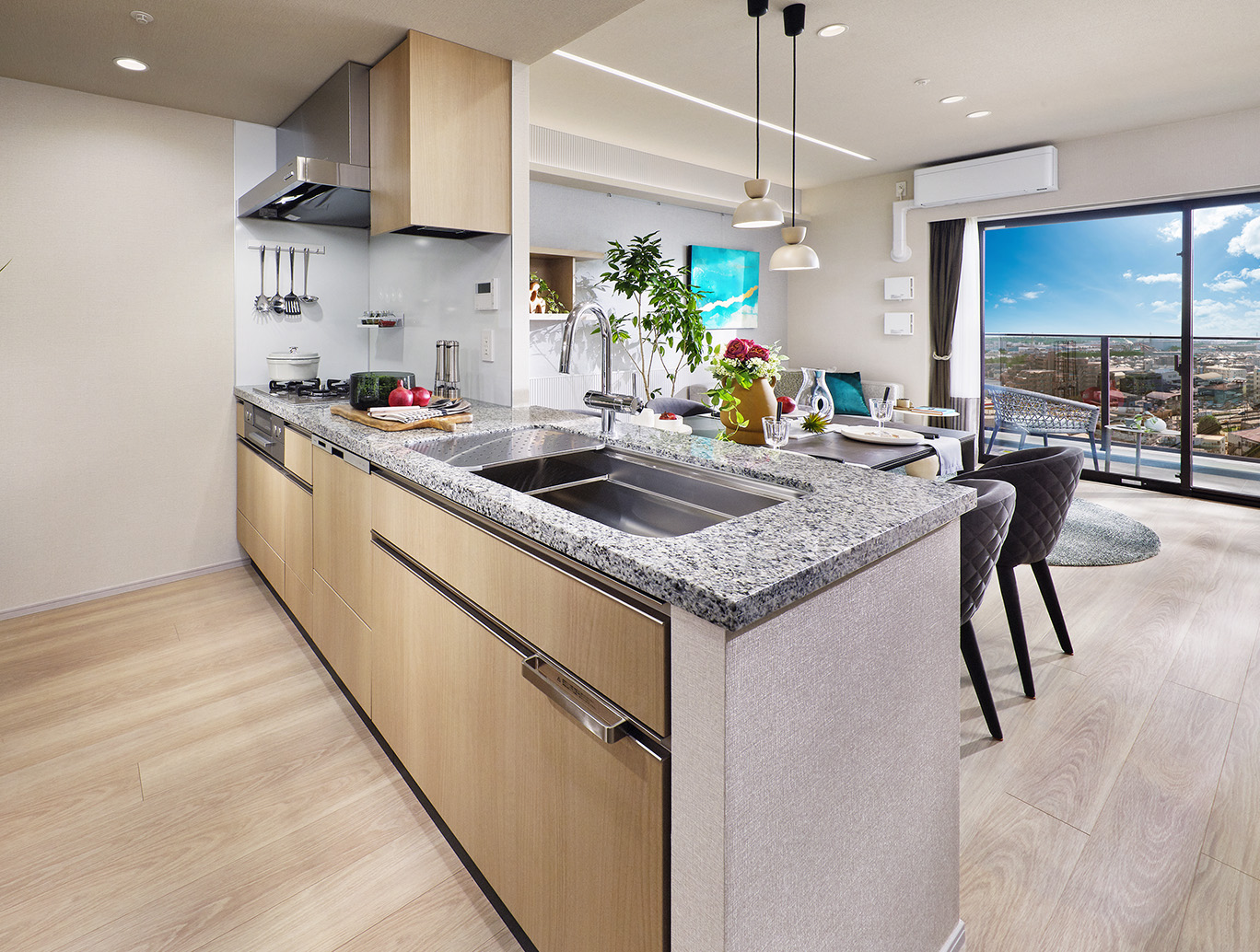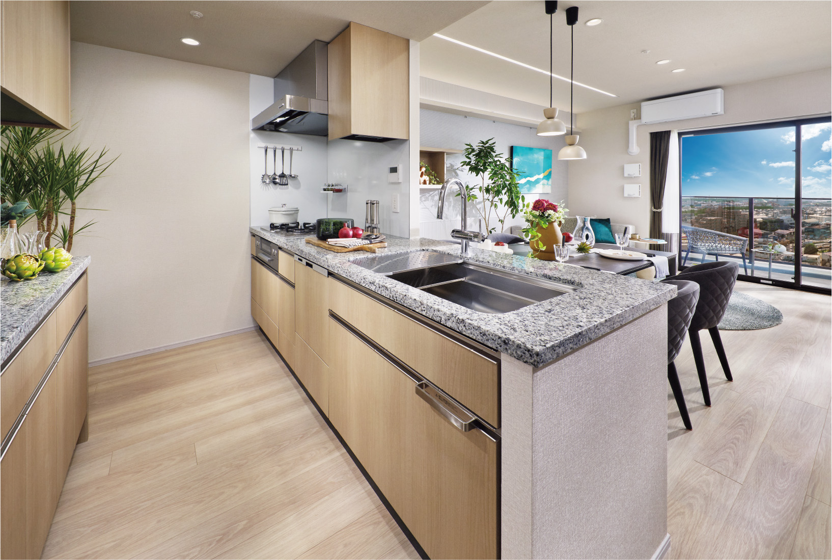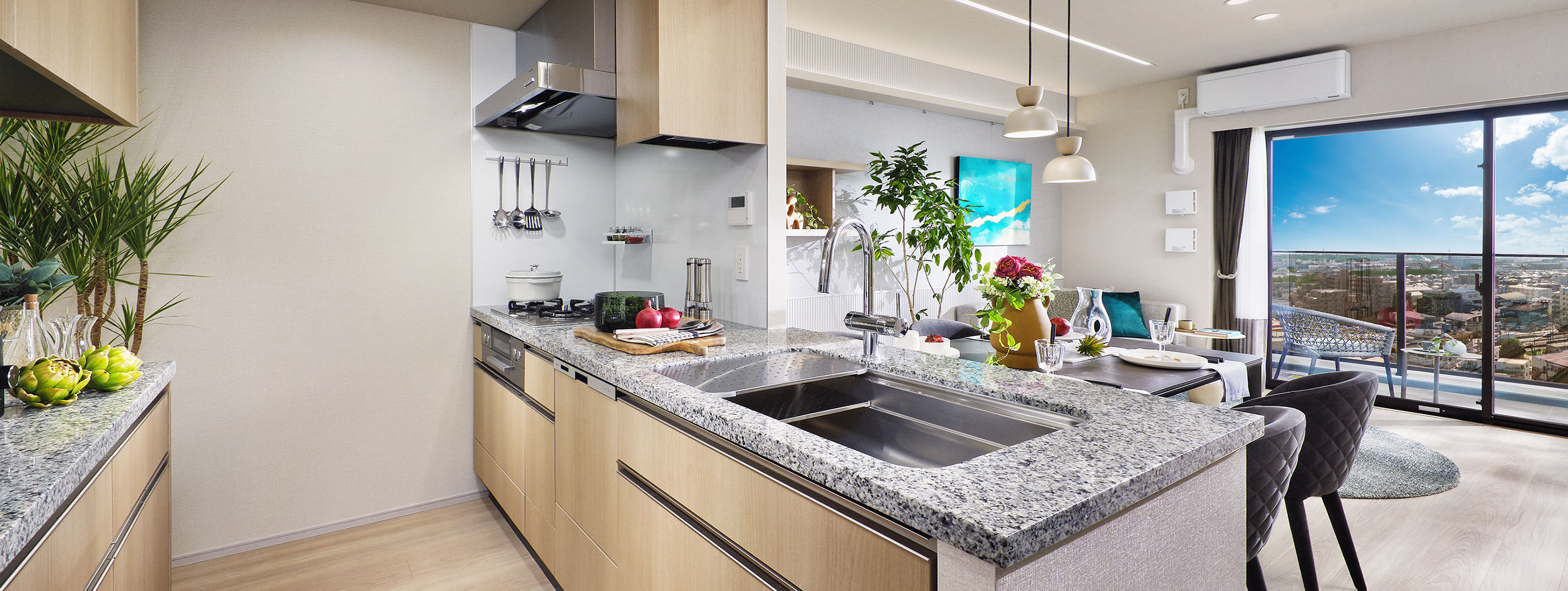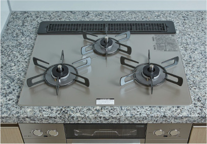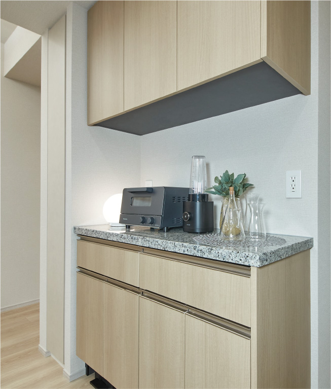 カウンタートップには格調高い天然石を採用。インテリアとしての上質感を感じさせるとともに、本格的な厨房空間を演出します。