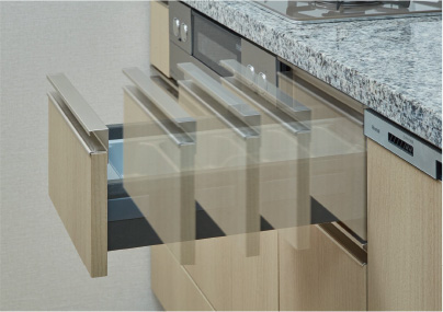 奥のものも取り出しやすいスライド収納は、勢いよく閉じても静かに閉まるソフトクローズ機能付きです。