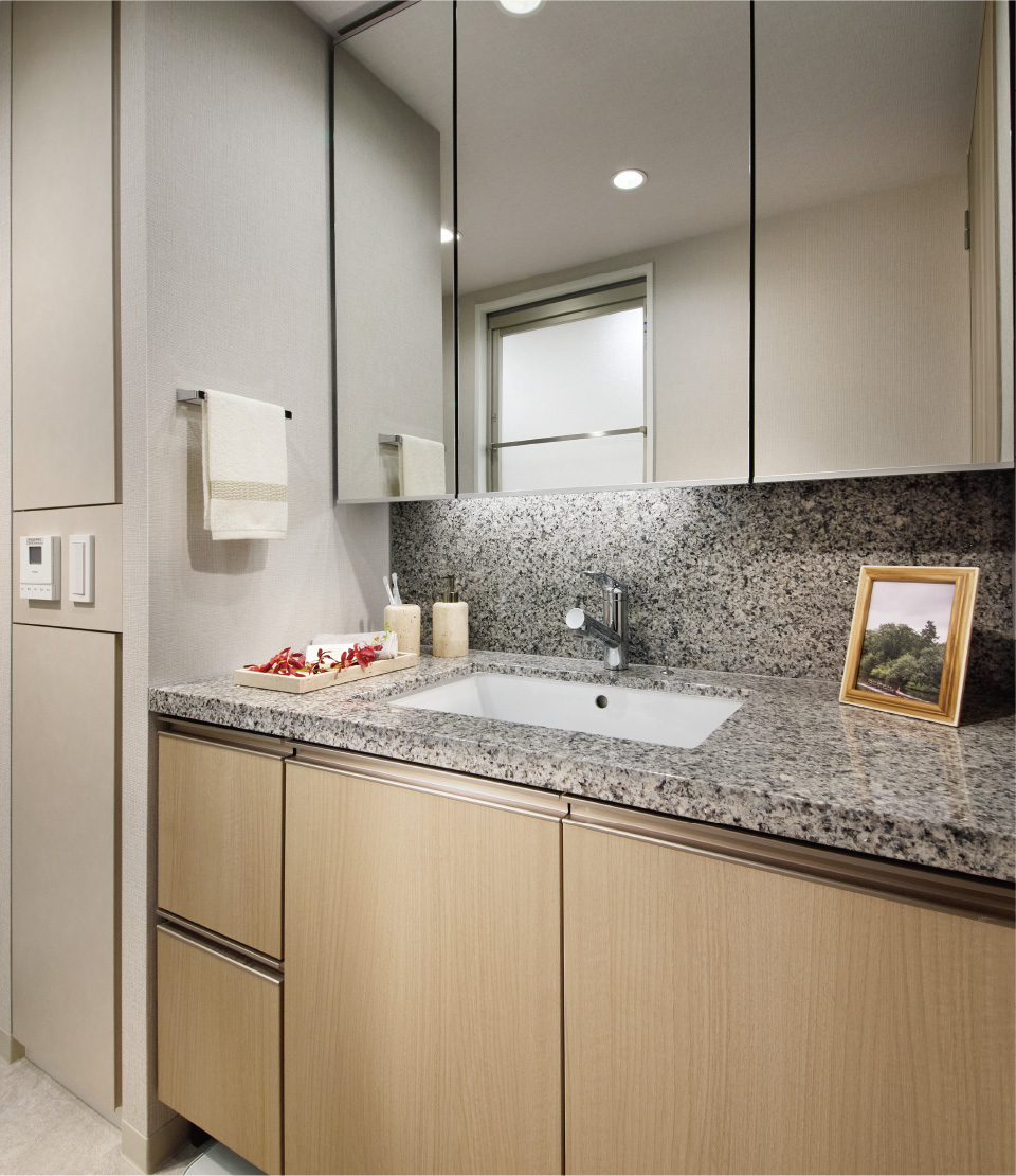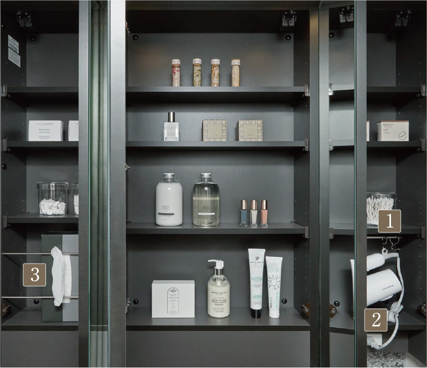 三面鏡の裏には、洗面⽤具などを機能的に収納できるスペースを設けました。また、扉には地震の際の安全性を高めるため、地震対策ラッチを採⽤しました。