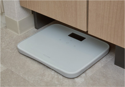 洗面化粧台の下部に、ヘルスメーターなどをすっきりと収められるスペースを確保しました。