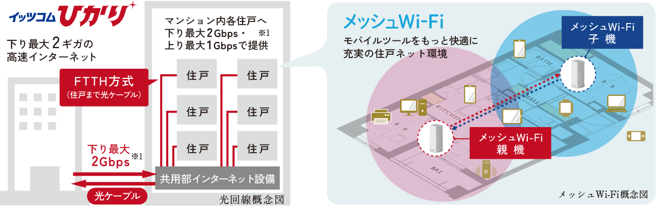 ネットワークからマンション内各住戸までを光ファイバーで接続し、下り最大2Gbps※1の高速インターネットサービスを実現する「イッツコムひかり」。通信環境のほか、多彩なコンテンツサービスを取り揃えています。