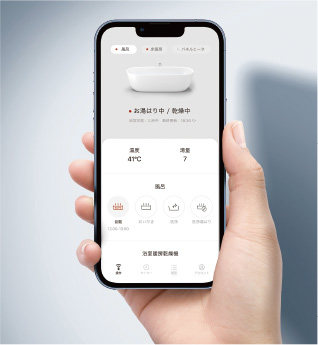 専用アプリの使用により、スマートフォンから遠隔操作で、自動お湯張り、保温、追い焚き、床暖房のON/OFFが可能。