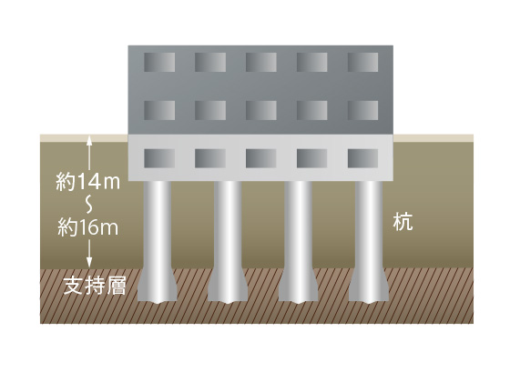 地盤面から約14m以深を支持層とし、鉄筋コンクリート杭にて建物を支持。