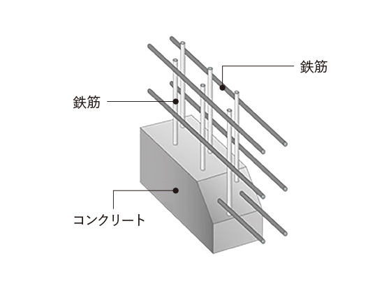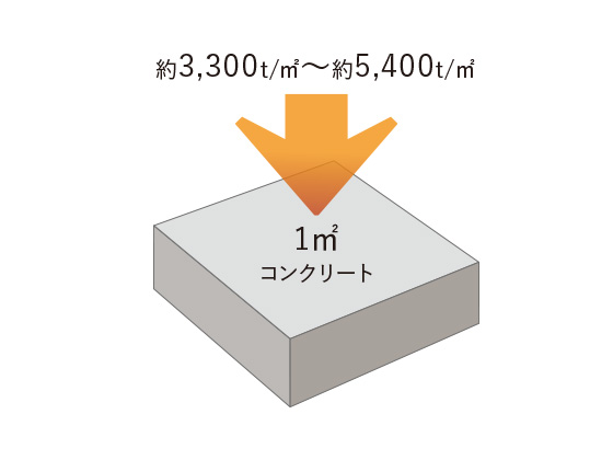 建物の構造耐力上主要な部分には、1㎡で約3,300t/㎡〜約5,400t/㎡の圧力に耐えられる設計基準強度33N/m㎡〜54N/m㎡のコンクリートを使用。