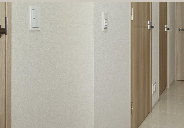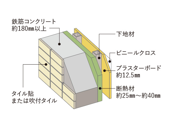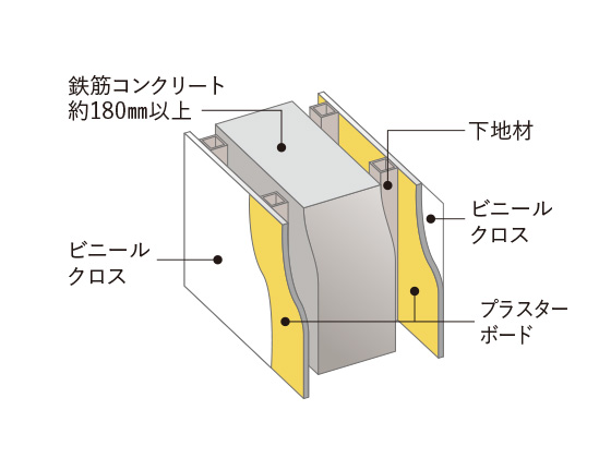 住戸の外壁は、鉄筋コンクリート厚さ約180㎜以上。さらに、外部に面する壁・柱・梁の内側に断熱材を吹き付けたうえで約12.5㎜のプラスターボードを施しています。
