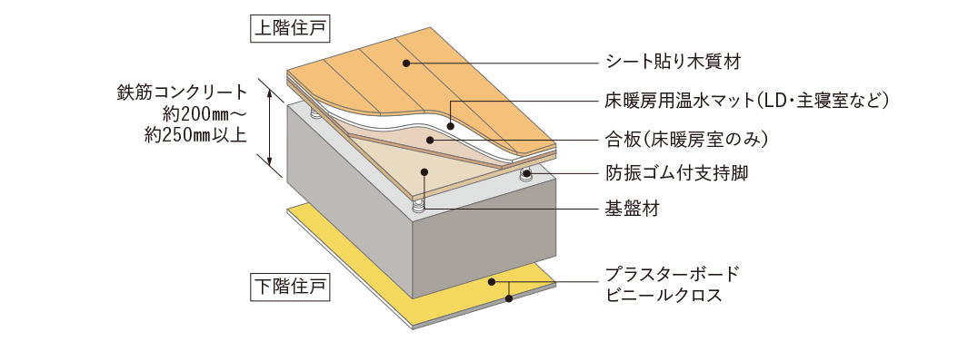 専有部分の床スラブ厚は、約200~250㎜以上を確保。二重床には軽量床衝撃音低減性能の等級がΔLL(Ⅱ)−3※(メーカー表示)の製品を採用し、遮音性に配慮しています。また、電気配線や水廻りの給水・排水管などをコンクリートスラブに打ち込まず、二重床・二重天井内に敷設することで直床や直天井に比べてリフォームやメンテナンス・更新が比較的容易な設計となっています(一部を除く)。
