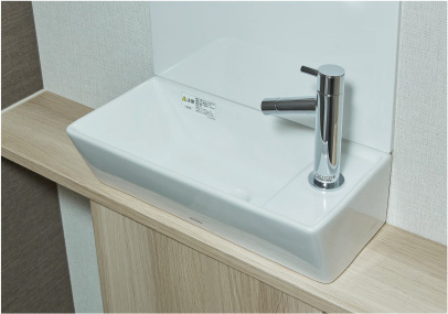空間にフィットするスマートなデザインの独立した手洗い器を設置しました。カウンターの下にはお手入れ用品も整理できる収納を設けています。