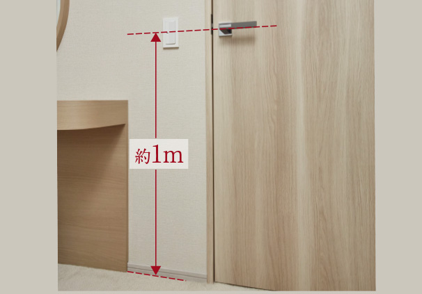 使いやすさを考えて、スイッチは床から約1mの高さに設定。また、室内扉のレバーハンドルをスイッチの高さに合わせています。