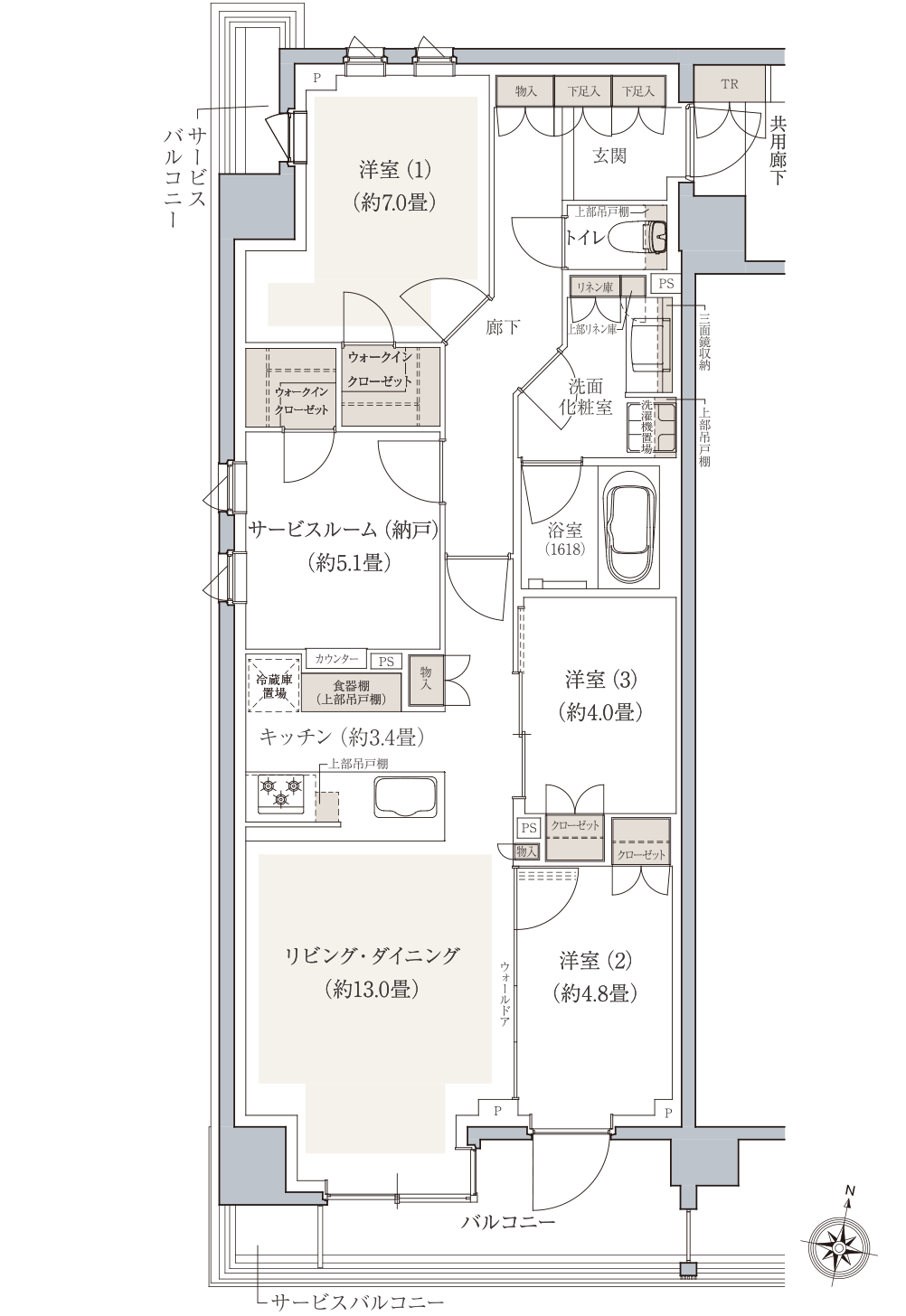 2つのウォークインクローゼットや食器棚、玄関の三連収納、約5.1畳のサービスルームを確保。