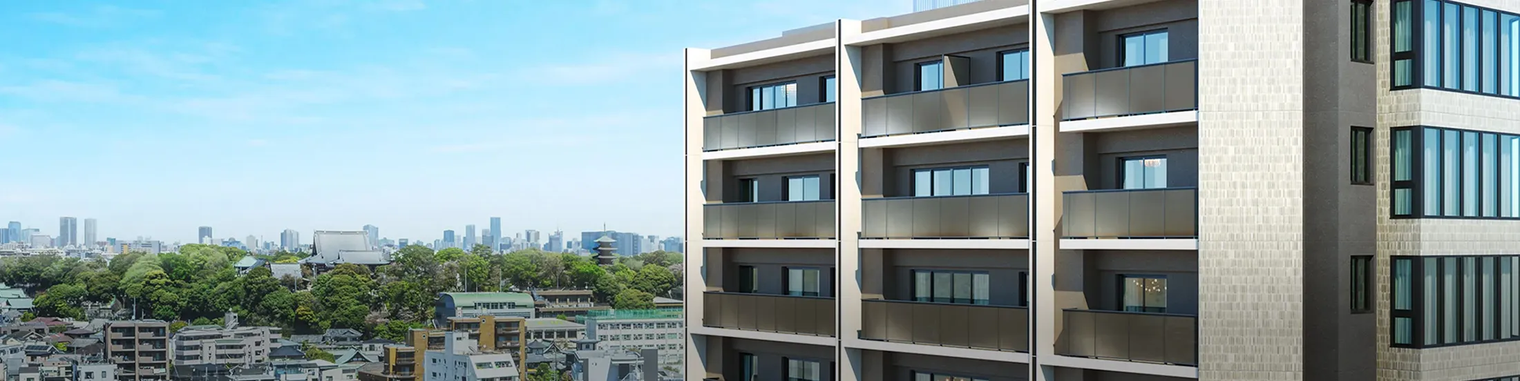 ※掲載の外観完成予想CGは2025年4月に撮影した眺望写真に計画段階の図面を基に描き起こした外観完成予想CGを合成・加工したものであり、形状・色味・タイル・石貼等の大きさは実際とは異なります。尚、外観完成予想CGは外観形状の細部、照明・排水設備、室外機・雨樋・換気口・避難ハッチ等の設備機器等は表現を省略または簡略化してあります。また、眺望・周辺環境は将来にわたって保証されるものではありません。