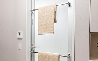 浴室扉の洗面化粧室側にタオルバーを2本設置。タオルをかけたり、バスマットをかけたり用途が広がります。