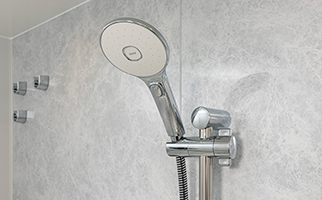 空気を含んだ大粒の水滴が心地よい超節水シャワー。水滴にたっぷりの空気を含ませることで、ボリュームのある浴び心地と節水の両立を実現しました。