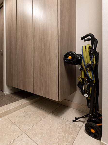 宅配用コンテナの一時保管や、ベビーカーの置き場などに便利な土間スペース。生活感を上手にコントロールできる、頼れる空間です。