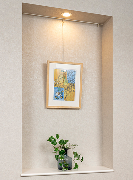 リビングや廊下に設けたニッチにはピクチャーレールを備え、お子様の作品や季節の飾りを気軽に掛け替えられる、家族の小さなギャラリー。大切な思い出が自然と集まる、心地よい空間になります。