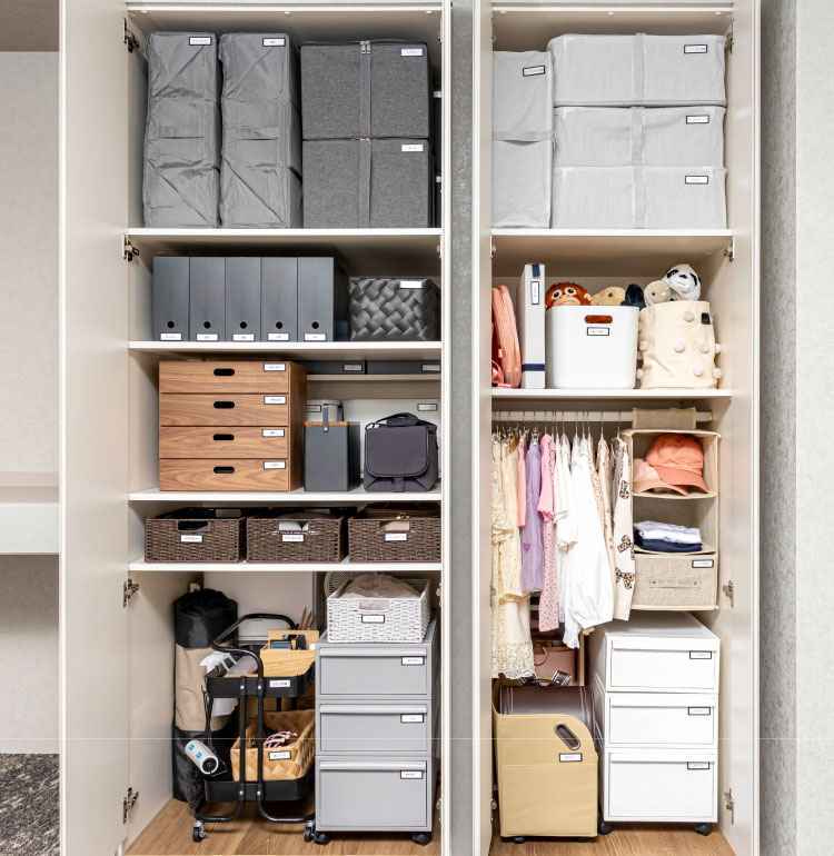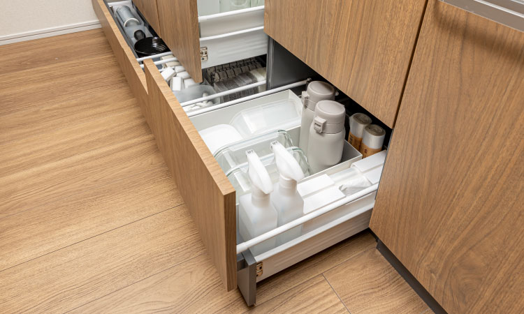 マルチ収納とキッチンフロアキャビネットは、整理収納コンサルティングのプロフェッショナル集団であるインブルームが監修。「マルチ収納」は棚板が前後で可変可能なため、布団やスーツケース、季節家電、防災用品などの大物収納やライフスタイルの変化に対応します。