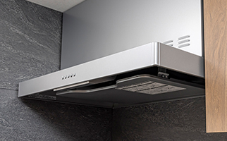 スタイリッシュな薄型レンジフードを採用。圧迫感を軽減し、開放的なキッチンを演出します。