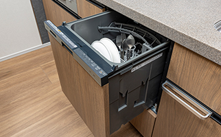 食器の出し入れがしやすいスライドオープン式です。節水効果に配慮した仕様とし、また食器の洗浄から乾燥まで、食後の水仕事を軽減します。