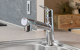 レバー操作ひとつで水量・温度の調節が可能。シャワーヘッドが引き出せシンクのお手入れもスムーズで美しく使いやすい浄水器一体型の混合水栓です。