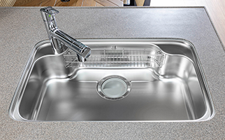 シンクの中のお手入れもシンクまわりの片付けも、スキっとはかどるシンクです。独自の底面形状と段差のコンビネーションで、シンクの奥の段差に向けて汚れやゴミをスムーズに洗い流せます。