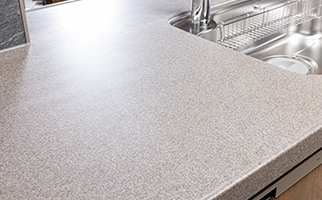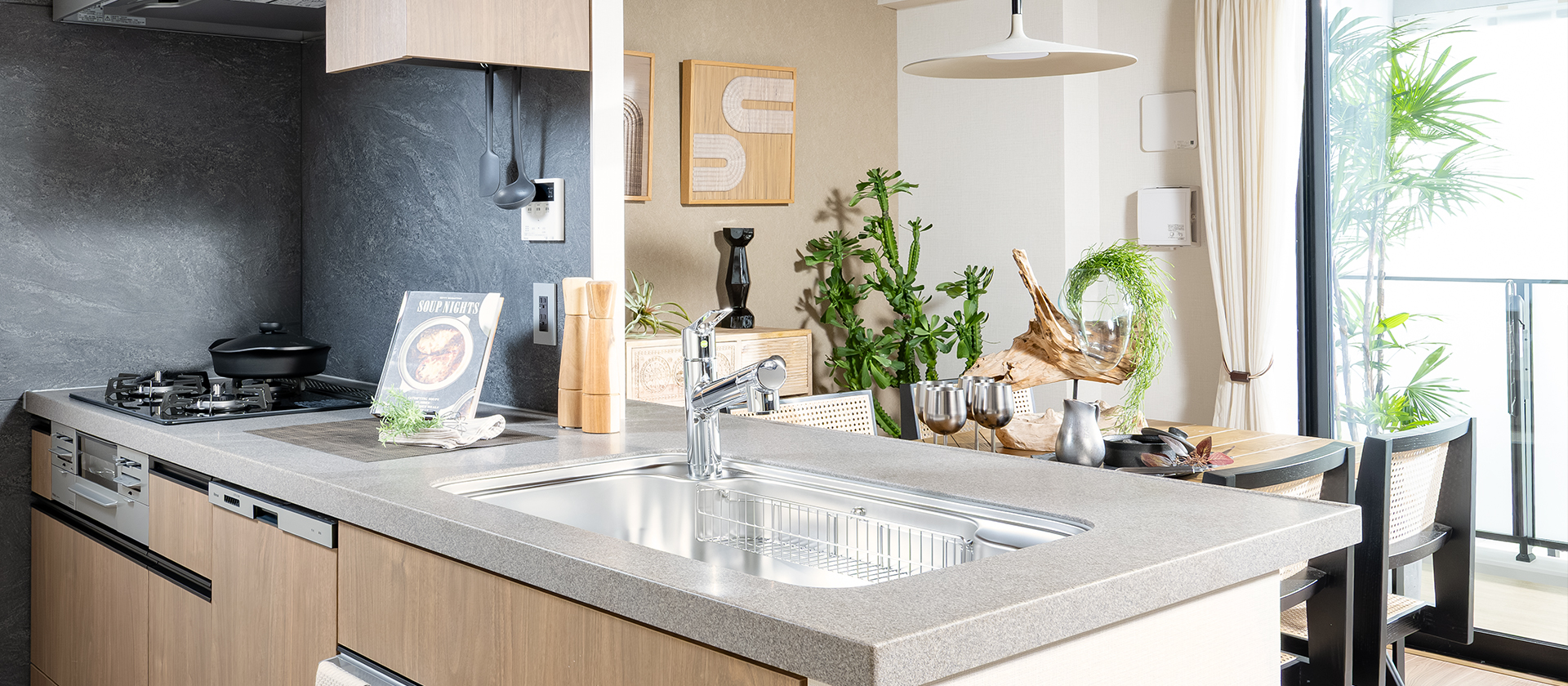耐久性・メンテナンス性が配慮され、汚れや傷にも強くお手入れが楽な人造大理石のキッチン天板を採用しました。