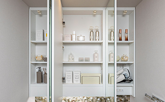 三面鏡の裏側はブラシや化粧品・洗面具などがすっきりと収まる便利な収納スペースとなっています。