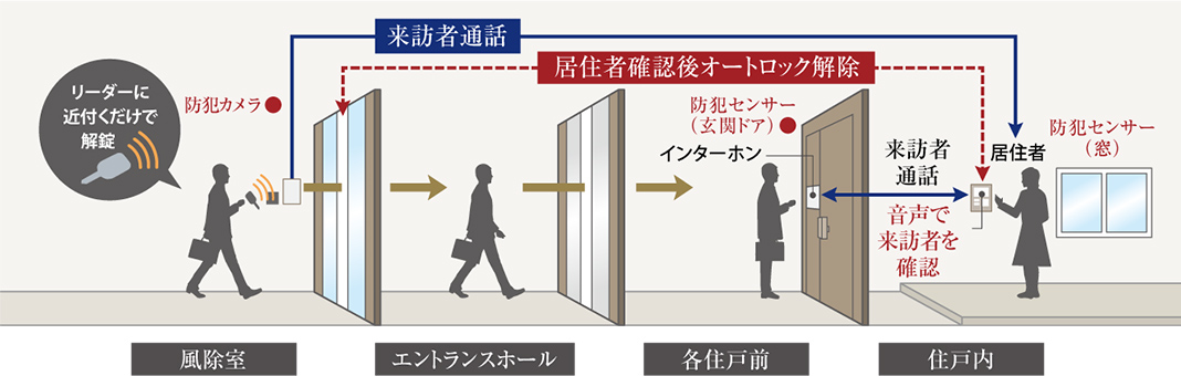 エントランスのオートロックや、玄関ドアにセキュリティシステムを採用。さらに24時間録画の防犯カメラ(共用部)や不法侵入を察知する防犯センサー(専有部)を採用し、住まう方の安心を守ります。