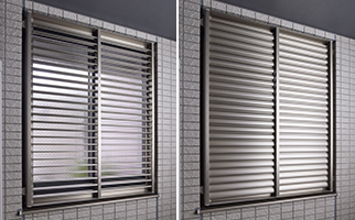 開放廊下側には、ルーバーを自由に調節でき、プライバシーを守りつつ通風・採光を確保できるルーバー面格子を採用。