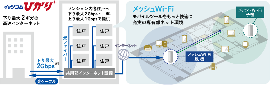 スマートフォンやオンライン会議、ネットゲームなど、ワイヤレス通信環境が欠かせない時代。下り最大2Gbps(※1)の高速インターネットサービスを実現する、「イッツコムひかり」を、居室内でさらに快適に利用できる「メッシュWi-Fi」がプラスされました。