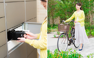 24時間使える居住者専用の自転車シェアサービスを3台完備。宅配ボックスの一部に電動自転車の鍵とバッテリーを収納。宅配ボックスを介して貸出・返却が行えます。