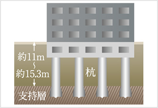 地盤面から約11m以深(最大約15.3m)を支持層とし、鉄筋コンクリート杭にて建物を支持しています。