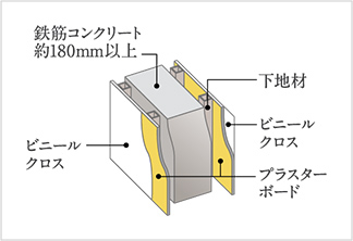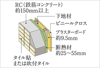 住戸の外壁は、RC(約150mm以上)を採用。さらに、外部に面する壁・柱・梁の内側に断熱材を吹き付けたうえで約9.5mmのプラスターボードを施し、断熱性に配慮しています。