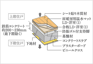 専有部の床スラブ厚は約200~230mmを確保し、遮音性に配慮。直床・直天井に比べ、リフォームやメンテナンスなども容易な設計となっています。