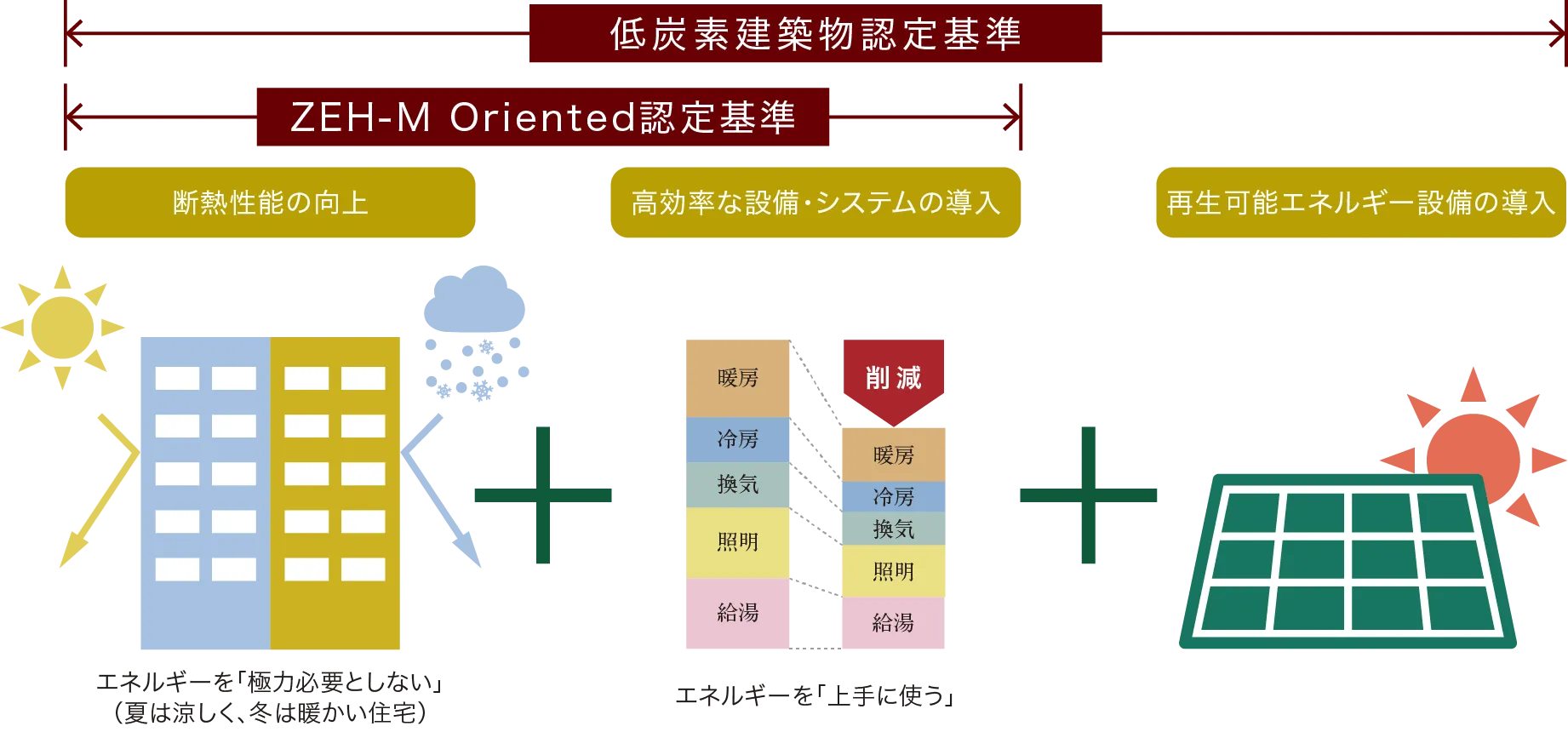 断熱性能の向上、省エネ設備の採用、再生可能エネルギーの活用に加え、節水や建物の長寿命化といった工夫も評価対象になります。